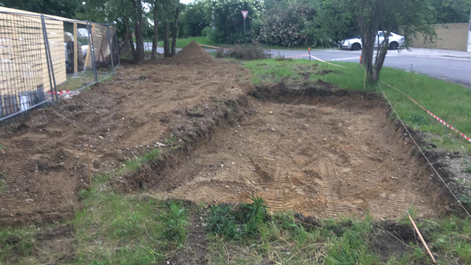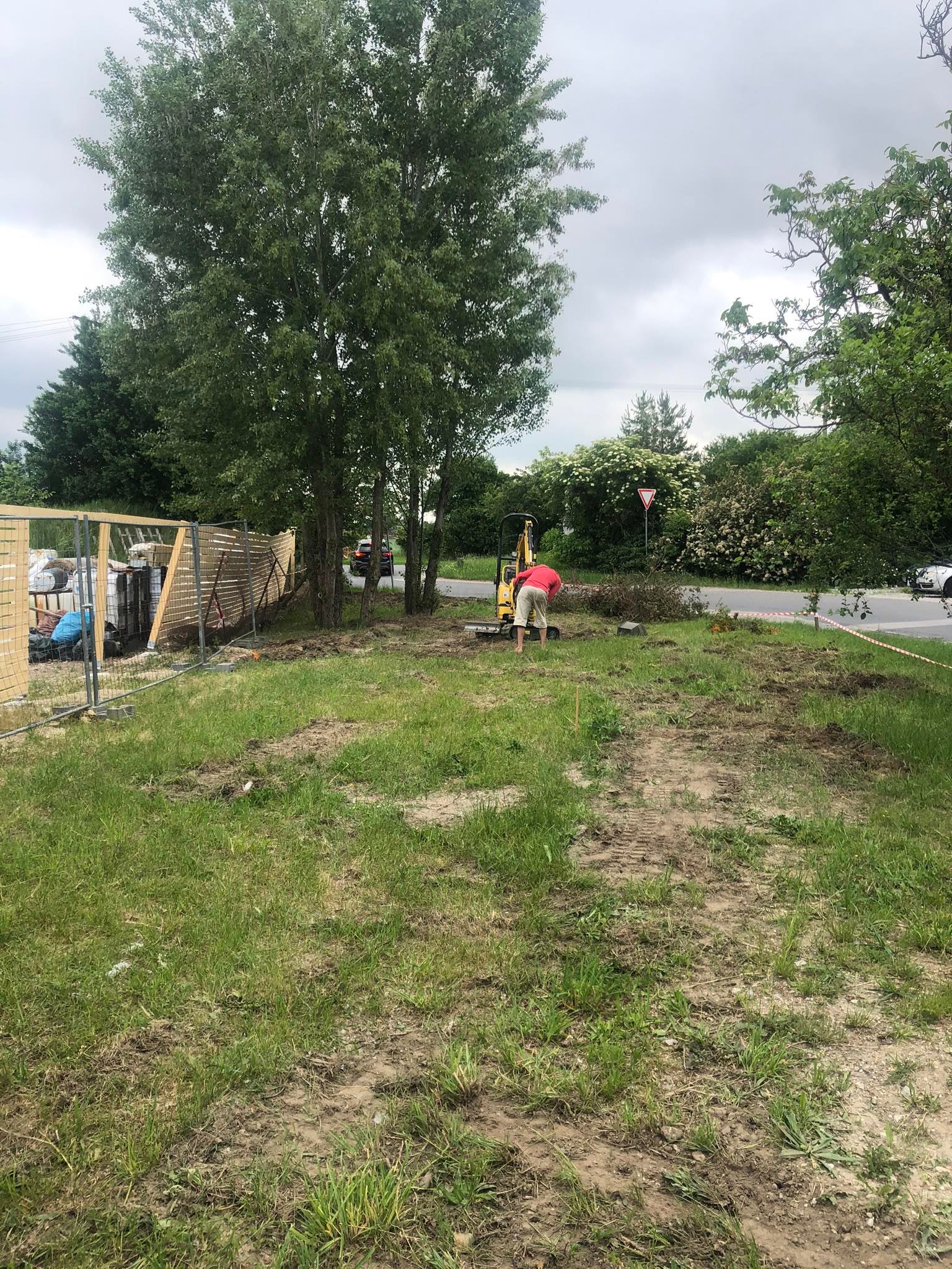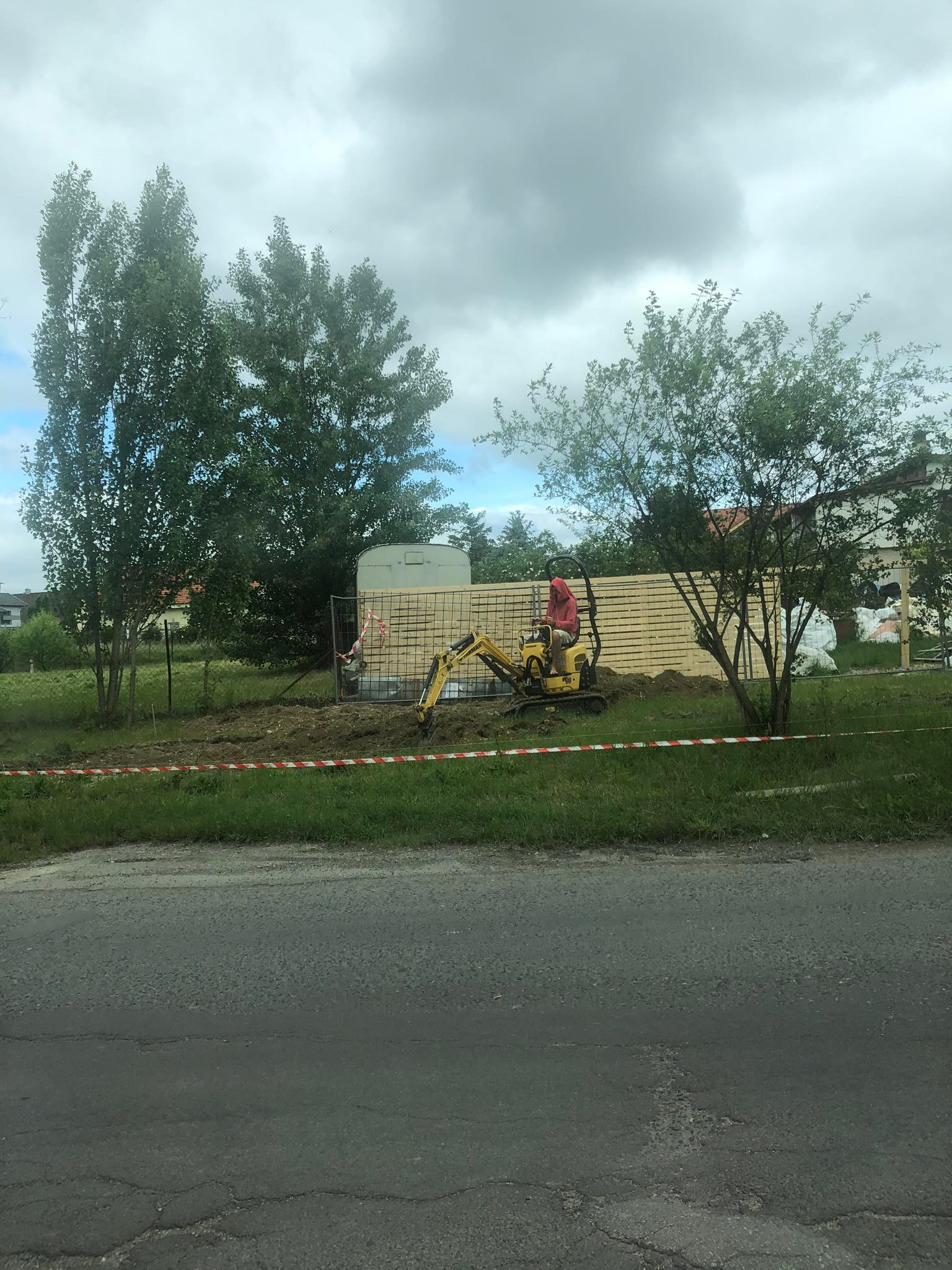 Na ťažké práce sme si objednali pomocníka z Vajnor, ktorý vlastní šikovný malý bágrik. S jeho pomocou sme vykopal jamu pre dvoj hojdačku a jamy pre základy spevňovacích vzper dreveného plota.