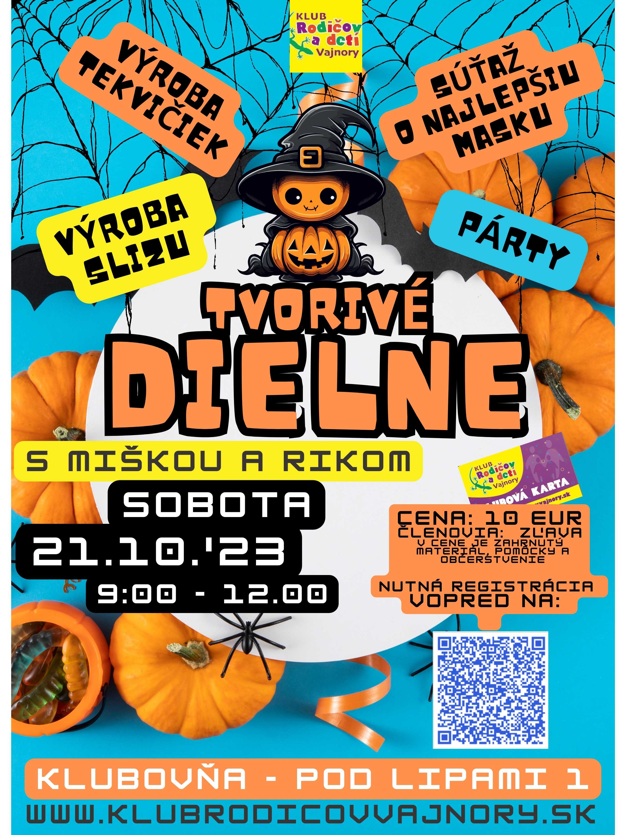 Srdečne pozývame všetky zábavychtivé deťúrence do našej Klubovne na Halloween párty, ktorá sa bude konať 21.10.2023 od 9:00 do 12:00 hod. O program sa v tento deň postarajú skúsení animátori Riko a Miška. Tešiť sa môžete na výrobu halloweenskej tekvičky a žabieho slizu. Odmena čaká aj na najnápaditejšiu masku. Nakoľko je počet miest limitovaný, nenechávajte si prihlásenie detí na poslednú chvíľu a zaregistrujte ich už teraz. Prihlášku nájdete TU.