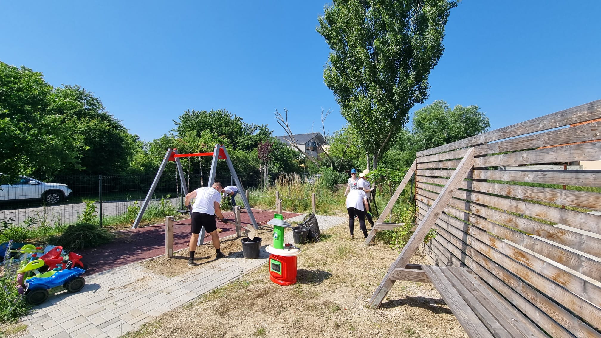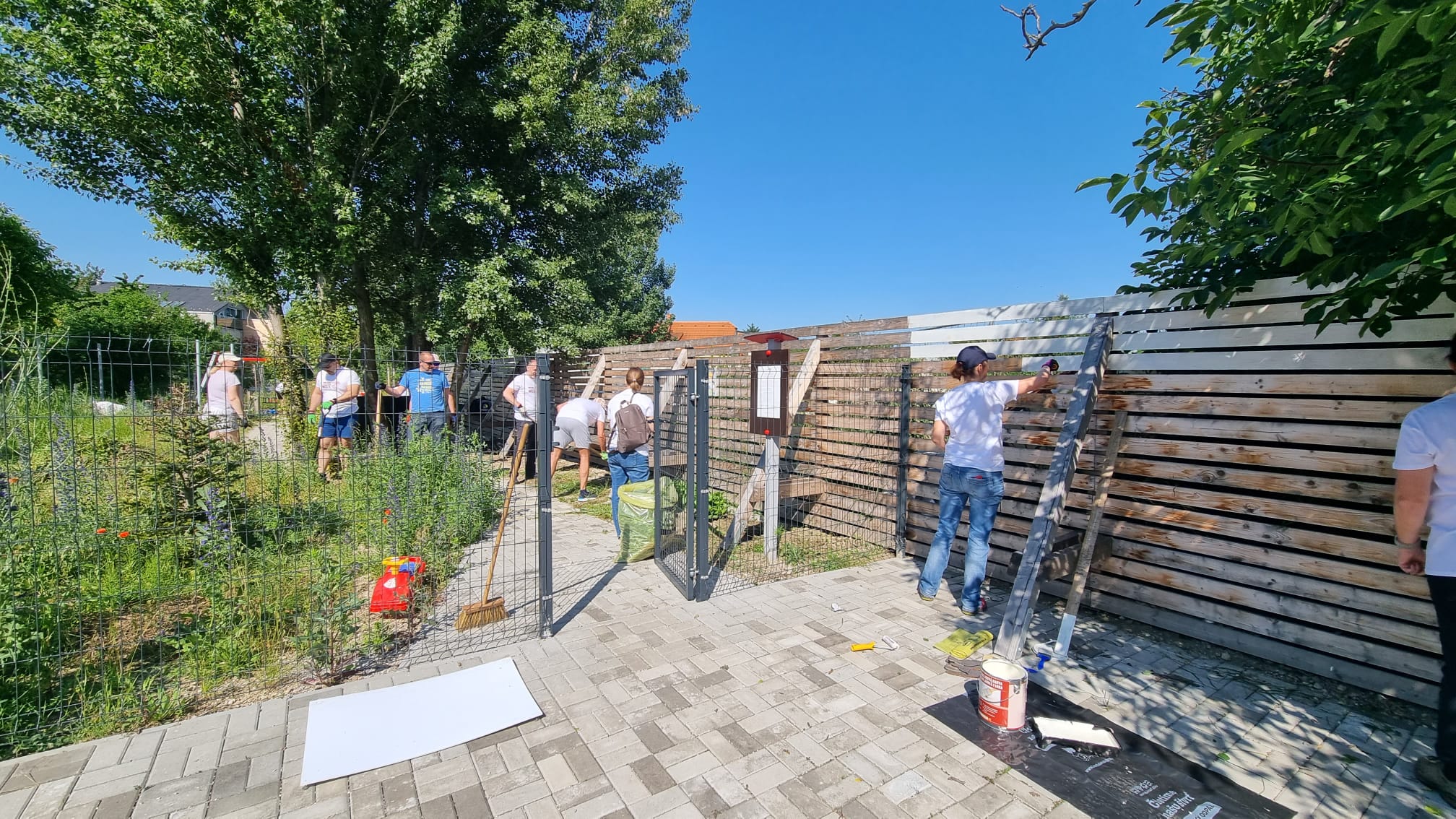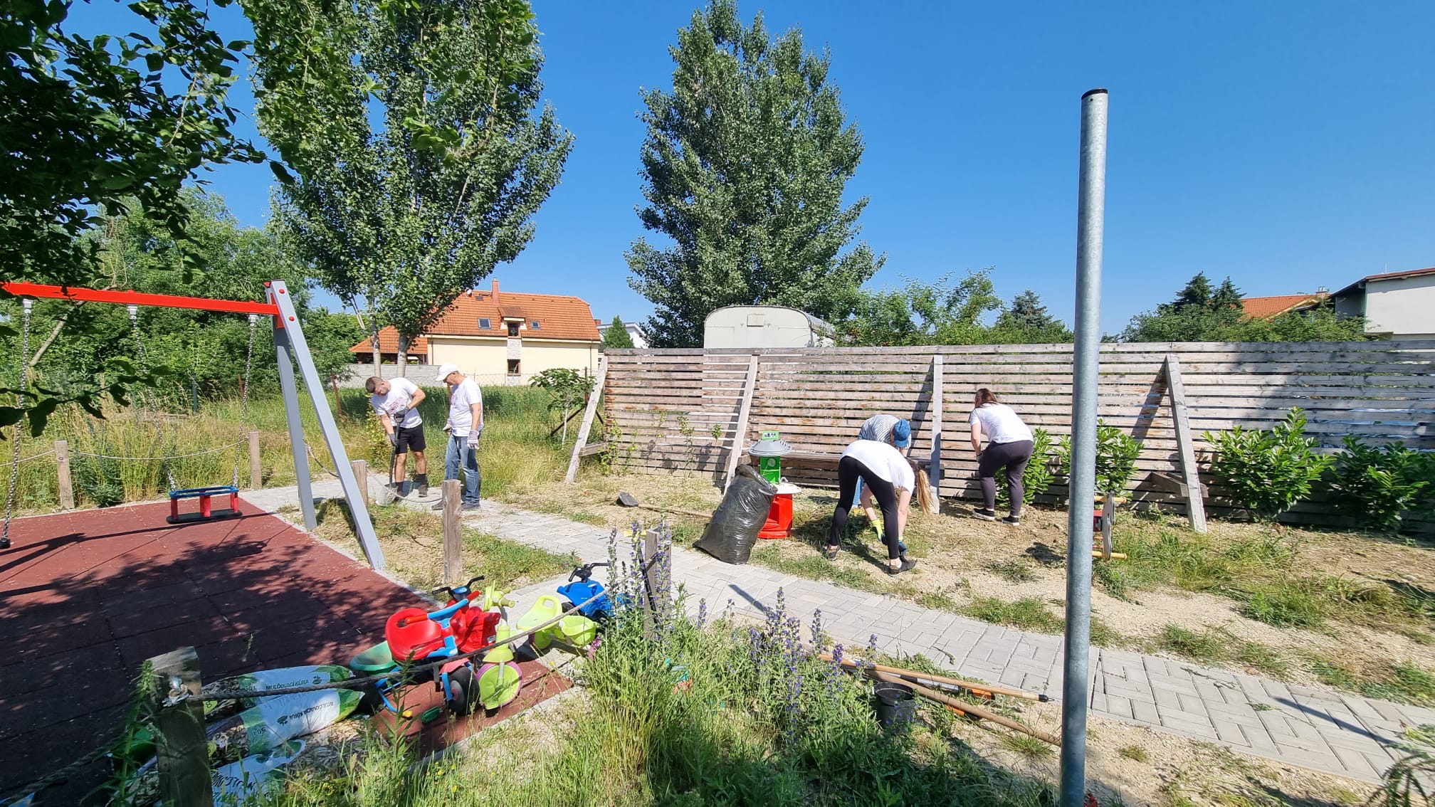 Na detskom ihrisku na rohu Príjazdnej a ul. Pri Mlyne nám firemní dobrovoľníci zo spoločností HP Inc Slovakia a z Profesie pomáhali natierať drevený plot, odstraňovať burinu a vysadiť novú zeleň. Ihrisko sme minulý rok vybudovali spolu s rodičmi zo Šinkovského vďaka sponzorom, grantom a príspevkom z 2% od rodičov, žijúcich v okolí a v jeho dobudovávaní pokračujeme postupne aj naďalej.