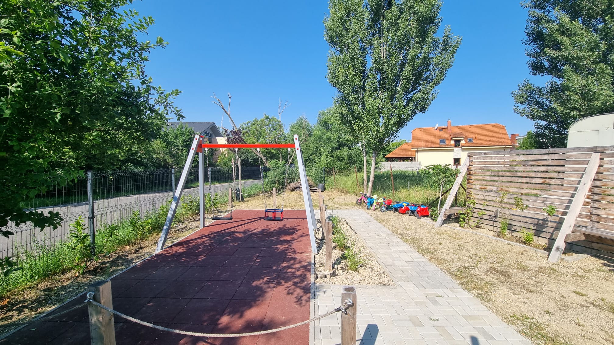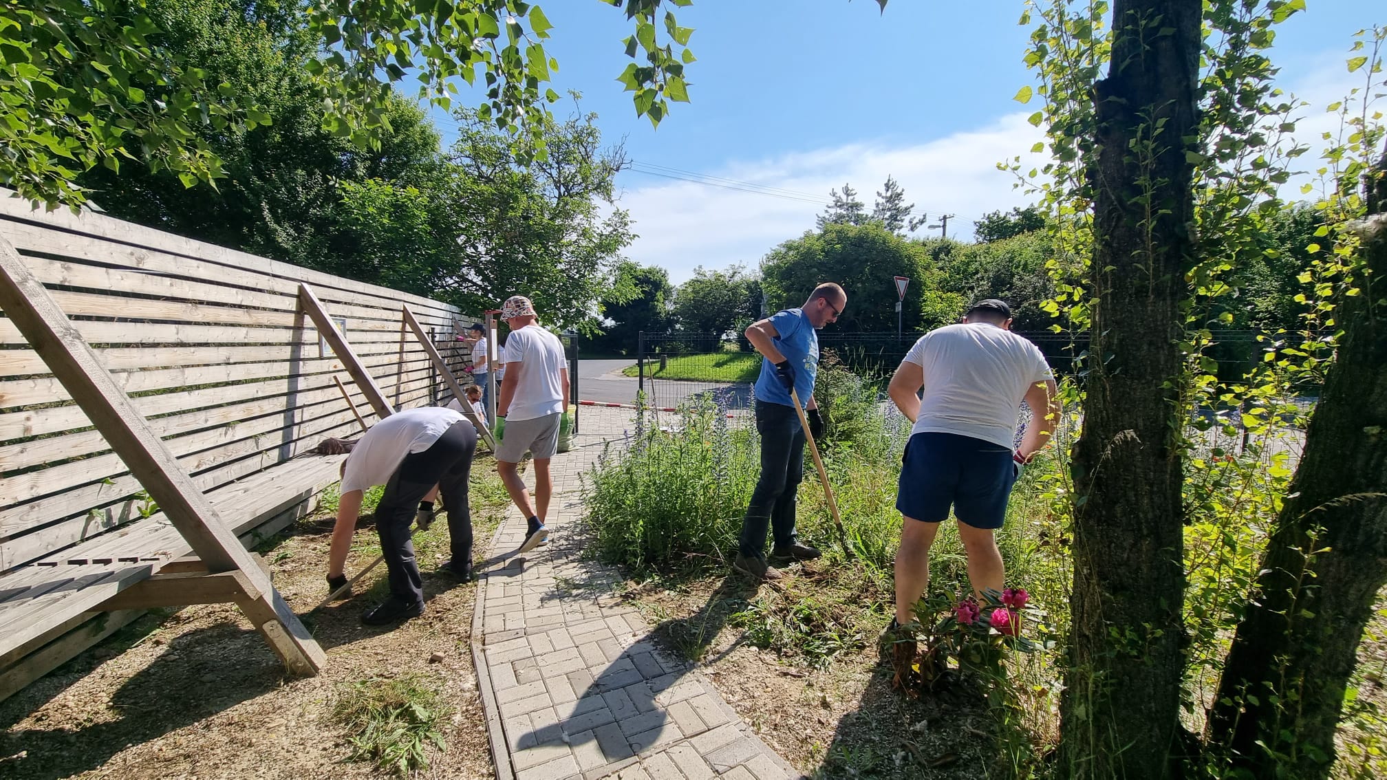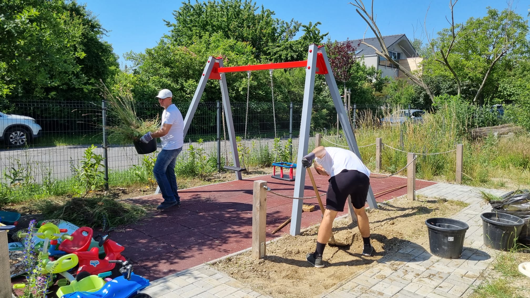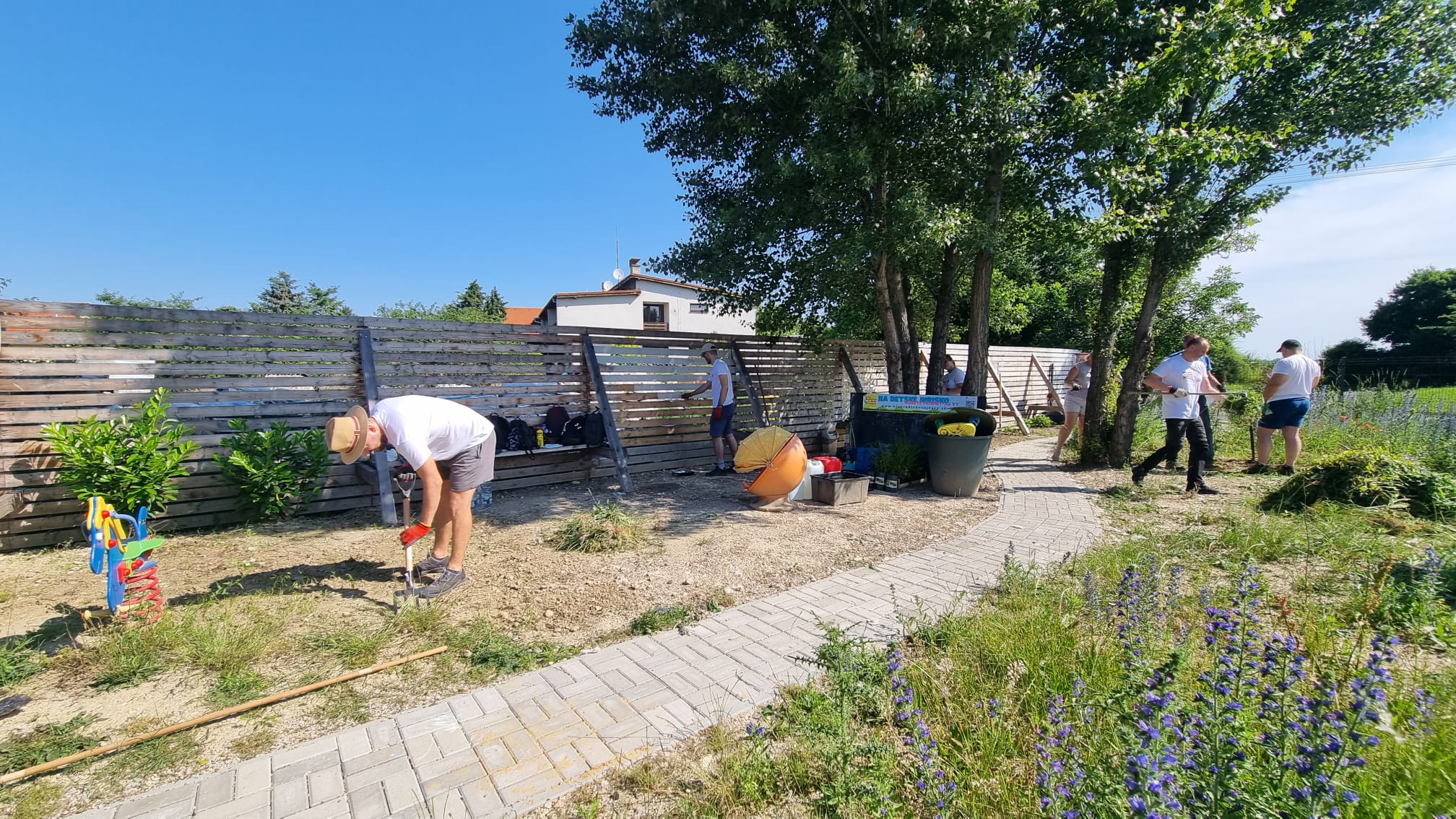 Na detskom ihrisku na rohu Príjazdnej a ul. Pri Mlyne nám firemní dobrovoľníci zo spoločností HP Inc Slovakia a z Profesie pomáhali natierať drevený plot, odstraňovať burinu a vysadiť novú zeleň. Ihrisko sme minulý rok vybudovali spolu s rodičmi zo Šinkovského vďaka sponzorom, grantom a príspevkom z 2% od rodičov, žijúcich v okolí a v jeho dobudovávaní pokračujeme postupne aj naďalej.