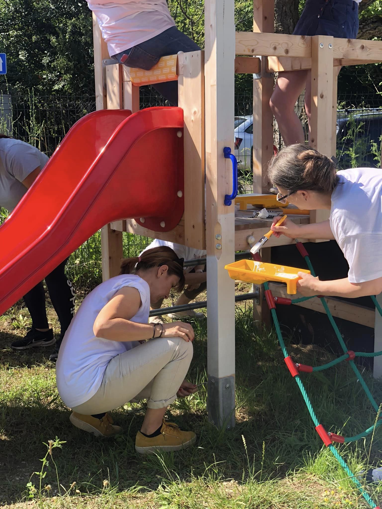 Dnes sme spolu s firemnými dobrovoľníkmi namaľovali na ihrisku drevený pozemok ochranným náterom, spevnili lavičky, namaľovali preliezku so šmykľavkou, vytrhli burinu a posadili zeleň. To všetko sa nám podarilo vďaka @Amazon Slovakia, @IBM, @Detsply Sirona Slovakia, @Tatra banka, @Yanfeng International Automotive Technology Slovakia a @Bajkovisko, pod vedením @Monika Debnárová @Ivan Kula @Gabika Matejčíková.